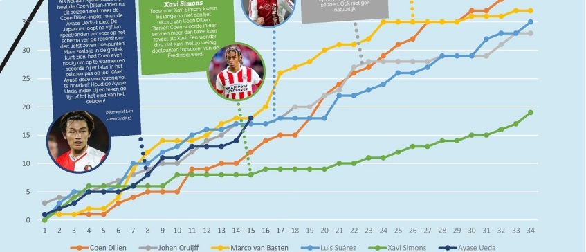 De Coen Dillen-index is een grafiek waarmee topscorers vergeleken worden met de ultieme topscorer van de Eredivisie-geschiedenis: Coen Dillen. In het seizoen 1956/57 maakte deze doelpuntenjager 43 goals! Om te laten zien hoe knap dit is, hebben we een aantal andere topscorers uit de Eredivisie-geschiedenis in de Coen Dillen-index gezet. Onder hen de nieuwste uitdager Ayase Ueda! De spits van Feyenoord is op weg naar een record.